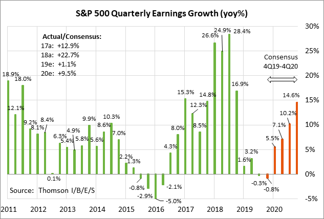 The consensus is for Q4 SPX earnings growth of -0.8% y/y (+2.4% ex-energy), according to Refinitiv. That would follow the weak 2019 quarterly growth rates of +1.6% in Q1, +3.2% in Q2, and -0.3% in Q3. Looking ahead, the consensus is for earnings growth of +5.5% in Q1-2020, +7.1% in Q2, +10.2% in Q3, and +14.6% in Q4. The consensus is for earnings growth in calendar 2020 to improve to +9.5% from the weak growth of only +1.1% seen in 2019 due to trade tensions and a hangover from the 2018 earnings surge of +23% on the massive tax cut.