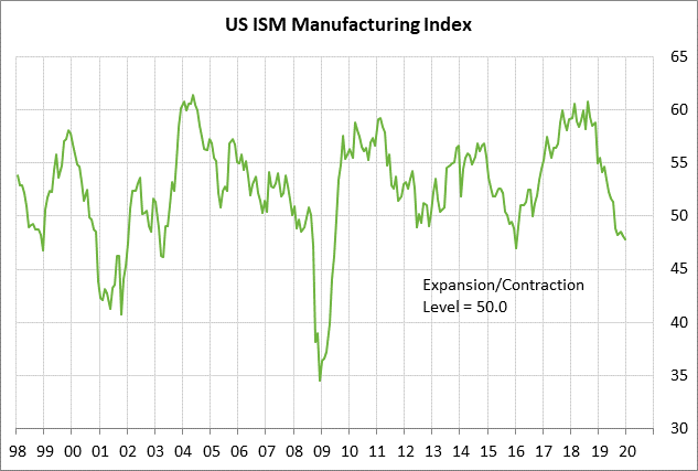 U.S. ISM manufacturing index will be largely overlooked since it will not fully reflect the virus impact — The market consensus is for today’s Jan ISM manufacturing index to show a +0.7 point increase to 48.5, more than reversing Dec’s -0.3 point decline to 47.8. The Jan ISM new orders index is expected to edge slightly higher by +0.1 to 47.7, adding to Dec’s +0.8 point increase to 47.6.