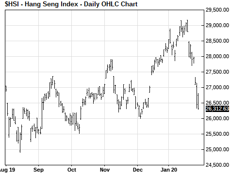 Markets wait for of Monday’s drop in Chinese mainland stocks — The global markets are waiting to see how far Chinese mainland stocks will drop when they reopen on Monday after the 6-session extended holiday. A sell-off of anything more than the 5-7% sell-off already seen in Chinese mainland stock proxies would negatively impact the rest of the global markets. The Hang Seng index last Friday closed -5.7% lower from its close on Jan 23, which was the last day of trading for mainland China. The iShares MSCI China ETF (MCHI), which trades on the Nasdaq, closed last Friday down by -6.8% from the Jan 23 close when mainland Chinese stocks were last open.