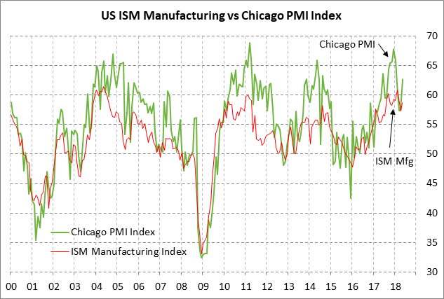 On the national front, the consensus is for Monday’s June ISM manufacturing index to show a -0.5 point decline to 58.2, giving back about a third of May’s +1.4 point increase to 58.7. The ISM index is in strong shape at only 2.1 points below February’s 14-year high of 60.8. Manufacturing confidence remains strong due to the strong U.S. economy and increased capex spending following the Jan 1 tax cuts. The decline in the dollar index in 2017 was also helpful for manufacturing exports, although the dollar in recent months has recovered to a 1-year high. The ISM new orders index was strong in May with a +2.5 point increase to 63.7, indicating that the orders pipeline is full and will support ongoing strength in production and shipments.