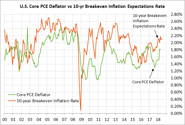 Today’s expected PCE deflator reports of +2.2% headline and +1.9% core would be very close to the Fed’s inflation target of +2%. The markets will not panic about today’s expected rise in the PCE deflators to a 6-year high because the Fed has made it clear that it will allow inflation to temporarily rise above its 2% inflation target since its target is symmetrical and is not a ceiling. If the Fed had not made that stance explicit, then Treasury yields might rise sharply if the markets thought the Fed was going to panic and start raising interest rates more sharply.
