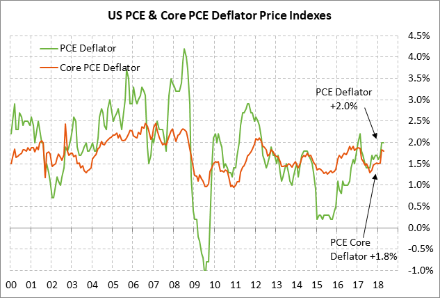 U.S. PCE deflator expected to rise to 6-year high and keep Fed on its tightening track — The market consensus is for today’s May PCE deflator to rise to +2.2% y/y from April’s +2.0%, which would match the 6-year high originally posted in Feb 2017. Meanwhile, today’s May core PCE deflator is expected to edge higher to +1.9% y/y from April’s +1.8%, thus matching the 6-year high of +1.9% posted in late 2016 and early 2017. The PCE deflator is the Fed’s preferred inflation measure.
