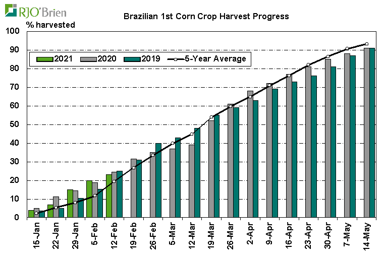 -Brazilian 1st corn crop harvest slightly behind last year, ahead of average