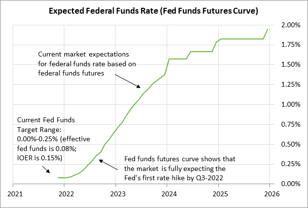 The federal funds futures market shows that the market is fully discounting the Fed’s first +25 bp rate hike in Q3-2022 and a second rate hike in Q4-2022.