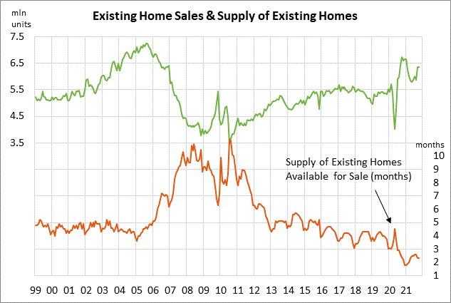U.S. existing home sales expected to remain strong — The consensus is for today’s Nov existing home sales report to show an increase of +3.0% m/m to 6.53 million, adding to October’s +0.8% increase to 6.34 million.  U.S. home sales have backed off from the upward spike seen in late-2020 but remain well above pre-pandemic levels.  Demand for homes is still strong due to the pandemic trends of moving into larger homes and moving away from multi-family units.  Also, mortgage rates remain extremely low, thus making homes more affordable.