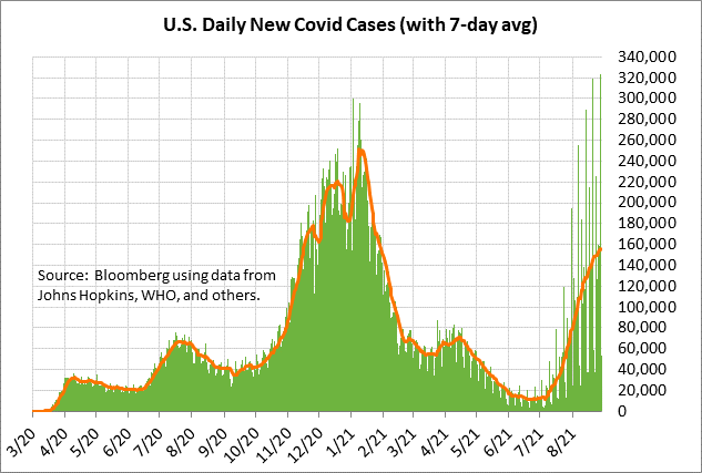 The U.S. last Friday hit a record one-day figure for new Covid infections of 323,403.  The 7-day average of new U.S. pandemic statistics reached a new 7-month high of 155,705 last Friday.  The 7-day average of Covid deaths last Friday rose to a new 5-month high of 1,265, up from the 16-month low of 185 deaths seen as recently as early July.