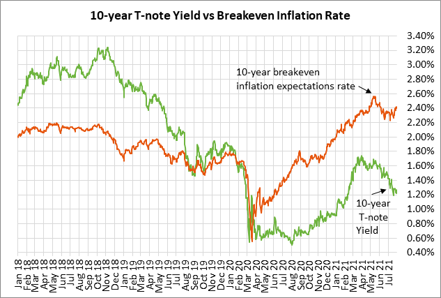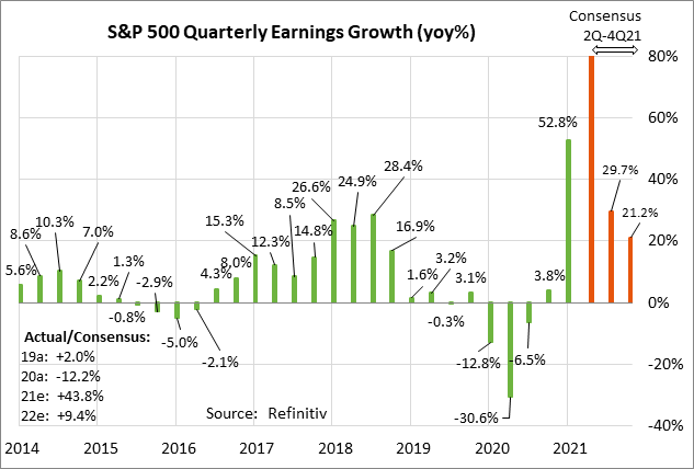The consensus is for Q2 earnings growth of +89.8% y/y for the S&P 500 companies, which is much better than the consensus of +65.4% as of July 1.  The year-on-year figure is, of course, inflated by the fact that earnings dropped sharply in Q2-2020 during the height of the pandemic economic shutdowns, causing a very low year-earlier base.  For all of 2021, the consensus is for earnings growth of +43.8%, more than recovering from the -12.2% decline seen in 2020.