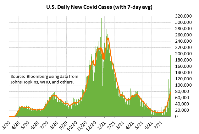 Rising U.S. Covid infection rate sparks worries about slower economic growth — The U.S. Covid infection rate continues to rise and cause market worries about weaker U.S. economic growth.  U.S. Covid infections have surged in just the past month as the Delta variant sweeps the country.  The 7-day average of new U.S. Covid infections last Friday rose to a new 5-1/2 month high of 77,796 cases, which is about seven times higher than the 16-month low of 11,351 posted just a month ago on June 23.