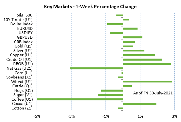 — The U.S. markets this week will focus on (1) the worsening global pandemic and the fall-out for the economy and the markets, (2) any further action by Chinese regulatory authorities against Chinese and U.S.-listed companies, (3) the Senate’s consideration of the $550 billion bipartisan infrastructure bill and the $3.5 trillion budget resolution, (4) this week’s busy Q2 earnings season with reports from 130 of the S&P 500 companies, (5) comments today by Fed Chair Powell at a virtual town hall with educators, and (6) key economic reports including today’s July ISM manufacturing index (expected +0.1 to 60.7) and Friday’s July payroll report (expected +900,000).