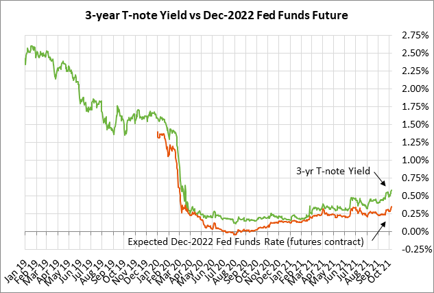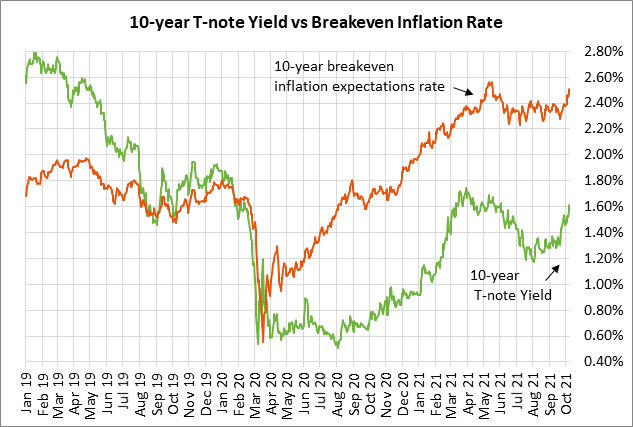 The T-note yield has also been pushed higher by increased inflation expectations. The 10-year breakeven inflation expectations rate last week broke out to a 4-3/4 month high of 2.52%, which is a half-percentage-point above the Fed’s 2.0% inflation target. Inflation expectations have been pushed higher by supply chain disruptions and strong commodity demand, factors that are likely to cause the recent inflation surge to extend at least into next year. The price of aluminum soared to a 13-year high Monday, while crude oil and gasoline prices surged to 7-year highs.