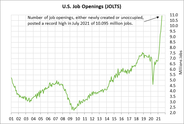 The record-high in job openings illustrates that there are plenty of jobs available. However, companies are having trouble filling those jobs with qualified persons due to a mismatch of skills with available jobs. There is also a labor shortage in some sectors. Many people are staying home and are avoiding taking a job because of worries about Covid exposure or perhaps to take care of children as the pandemic drags on. On the other hand, enhanced job benefits expired in early September, which should encourage some people to get back to work.
