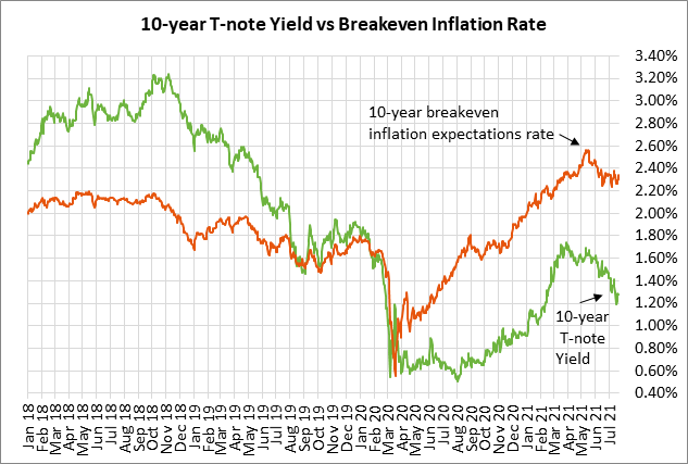The FOMC this week may even sound a bit more dovish than its June meeting since U.S. Covid infections have more than tripled since the June meeting. The Delta variant is a worrisome development for the Fed since there is no way to tell when the current spike in new infections may end. The Fed is not likely to proceed with QE tapering until the Delta variant has been contained and infections are down to a relatively low level.