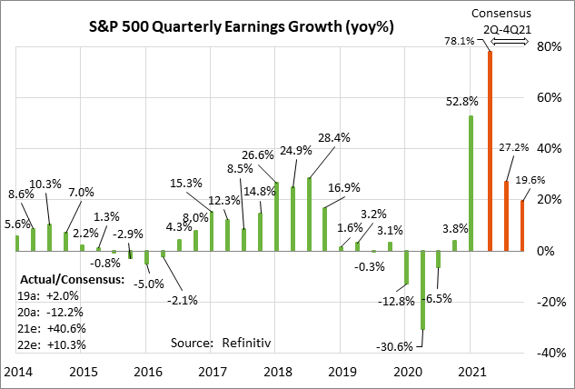 The consensus is for Q2 earnings growth of +78.1% y/y for the S&P 500 companies, which is much better than the consensus of +65.4% as of July 1. The year-on-year figure is, of course, inflated by the fact that earnings dropped sharply in Q2-2020 during the height of the pandemic economic shutdowns, causing a very low year-earlier base. For all of 2021, the consensus is for earnings growth of +40.6%, more than recovering from the -12.2% decline seen in 2020.