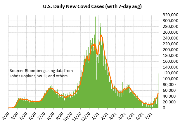 Rising U.S. Covid infection rate sparks worries about slower economic growth — The U.S. Covid infection rate continues to rise and cause market worries about weaker U.S. economic growth. U.S. Covid infections have tripled in just the past month as the Delta variant sweeps the country. The 7-day average of new U.S. Covid infections last Friday rose to a new 2-3/4 month high of 49,683 cases, which is more than quadruple the 16-month low of 11,351 posted just a month ago on June 23.