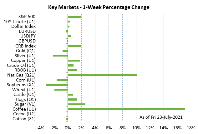 Weekly global market focus — The U.S. markets this week will focus on (1) the outcome of the Tue/Wed FOMC meeting, (2) whether the U.S. Covid infection rate continues to climb due to the Delta variant, (3) the peak Q2 earnings week with 177 reporting SPX companies, (4) the Treasury’s sale of $211 billion of T-notes today through Thursday, and (5) this week’s busy U.S. economic calendar that kicks off with today’s June new home sales report (expected +4.0% after May’s -5.9%).