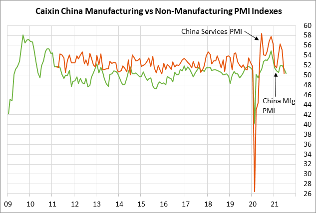 The Caixin China manufacturing PMI on Monday night then fell by -1.0 point to 50.3, which was weaker than the consensus for a -0.3 point decline to 51.0. The consensus is for Tuesday night’s July Caixin China services PMI to show a +0.2 point increase to 50.5, stabilizing after June’s sharp -4.8 point drop to 50.3.