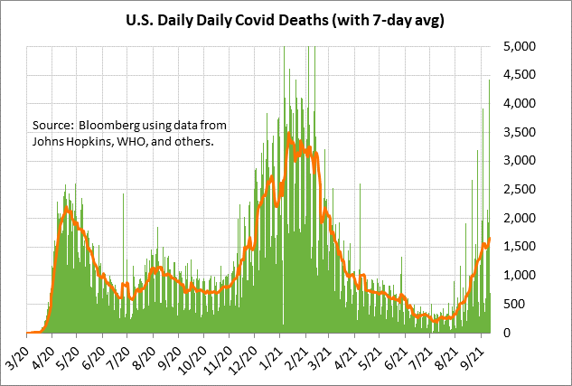 The 7-day average of daily new U.S. Covid infections on Saturday fell by a total of -14% to 144,928 from the 7-1/2 month high of 167,680 posted on September 1. However, the 7-day average of daily Covid deaths on Saturday rose to a 6-month high of 1,655 deaths.