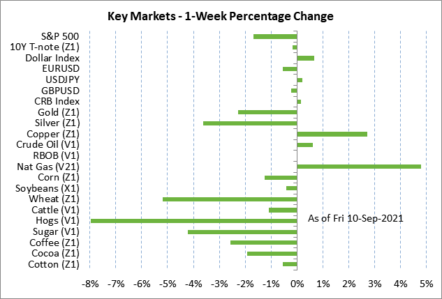 Weekly market focus — The U.S. markets this week will focus on (1) whether the U.S. Covid infection levels continue to decline, (2) whether the FOMC at its meeting next week will formally announce QE tapering, (3) the return of the Senate to session this week and the House next week as Congress needs to work on the continuing resolution, a debt ceiling hike, the $550 billion bipartisan infrastructure bill, and the Democrat’s $3.5 trillion spending bill, (4) the U.S. inflation situation with tomorrow’s release of the Aug CPI (expected +5.3% y/y headline and +4.2% y/y core), and (5) whether Friday’s early-Sep U.S. consumer sentiment index shows a recovery from August’s 10-year low.