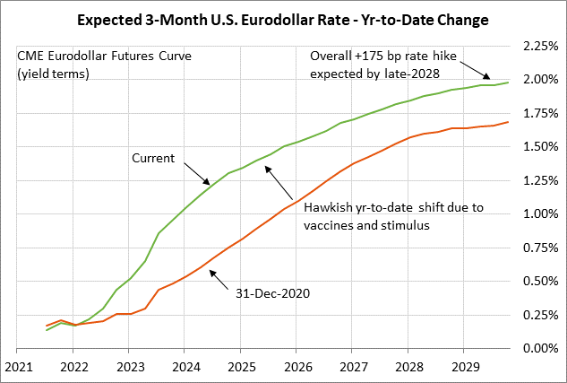 The Dec 2023 federal funds futures contract on Wednesday showed a slightly hawkish reaction to the FOMC meeting outcome by rising +3.5 bp to 0.68%.  The market is still not fully expecting a +25 bp rate hike until early 2023, and is then expecting a second rate hike later in 2023.