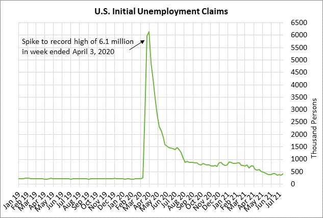 Initial claims expected to reverse part of last week’s surge — The consensus is for today’s weekly initial unemployment claims report to show a decline of -34,000 to 385,000, reversing most of last week’s +51,000 increase to 419,000.  Last week’s increase in initial claims was mostly due to technical factors, but there may have also been an increase in layoffs as some businesses cut back due to the recent surge in Covid infections.  Initial claims are currently +203,000 above the pre-pandemic level seen at the end of February 2020.