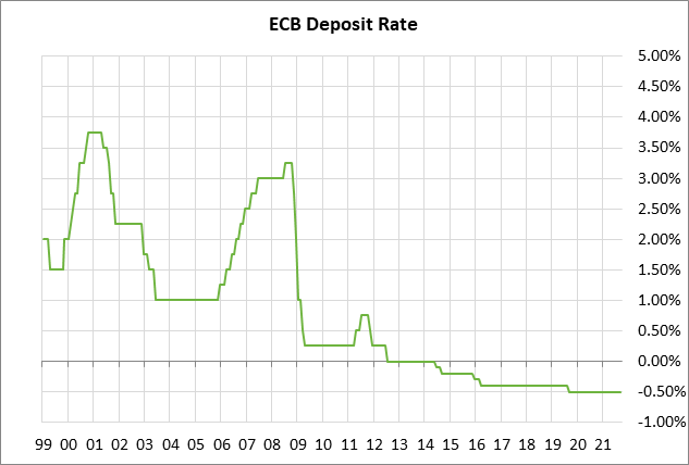 The ECB today is expected to leave its deposit rate unchanged at -0.50%, where that rate has been since September 2019. Before the pandemic emerged, the ECB in September 2019 cut the deposit rate by -10 bp to -0.50% due to the weak Eurozone economy and the weak inflation outlook.
