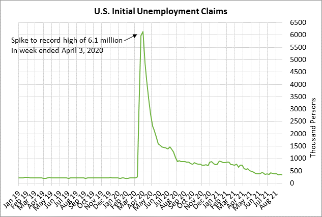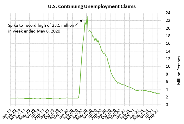 U.S. weekly unemployment claims show continued labor market improvement — The recent weekly unemployment claims data has shown a steady improvement in the U.S. labor market. The consensus is for today’s weekly initial unemployment claims to fall -5,000 to 335,000 following last week’s -14,000 decline to 340,000. The continuing claims series last week fell by -160,000 to a new 18-month low of 2.748 million.
