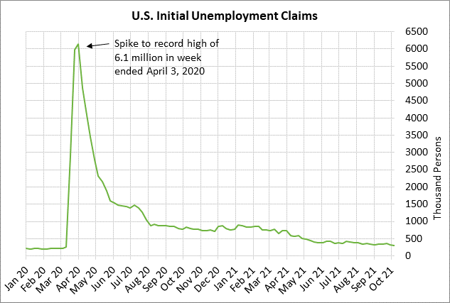 Unemployment claims expected to show continued labor market strength — The consensus is for today’s weekly initial unemployment claims report to show a +4,000 increase to 297,000, but that would only retrace a small portion of the declines of -35,000 and -36,000 seen in the past two weeks. Initial claims last week fell to a new 1-1/2 year low of 293,000 and were only 77,000 above the pre-pandemic level.
