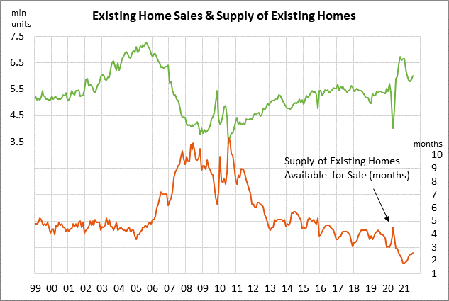 Also, existing home sales have cooled off a bit to 5.99 million units from the 15-year high of 6.73 million seen in October 2020. Home sales have cooled in part because of resistance to the surge in home prices. Potential home-buyers are turning more cautious since they don’t want to be left holding the bag by buying a home at what could be near the peak of the pandemic bubble.