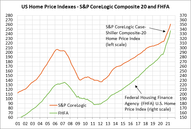 U.S. home prices continue to see an upward squeeze due to the combination of strong demand and tight supplies. Home prices have shown double-digit increases on a year-on-year basis every month this year. From the pre-pandemic level seen in December 2019, the FHFA index has risen by a total of 20% and the Composite 20 index has risen by a total of +19%.