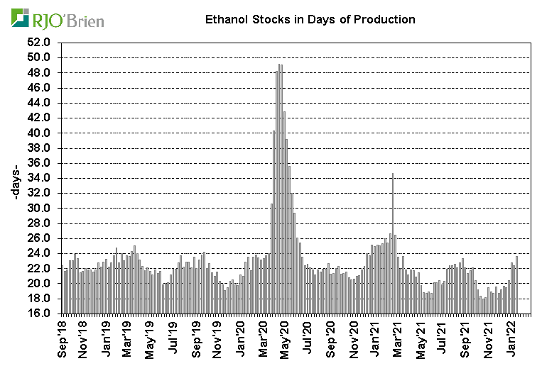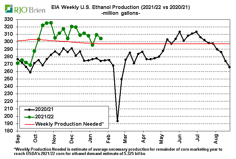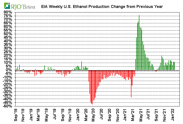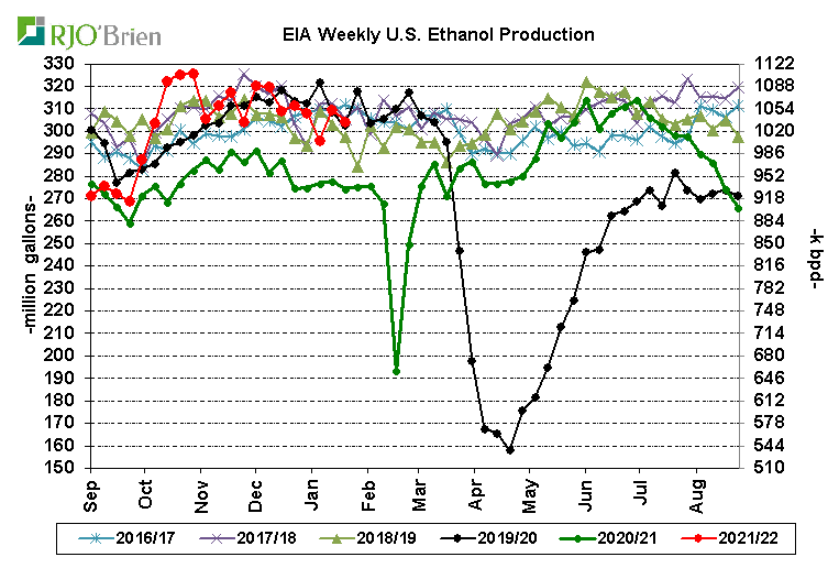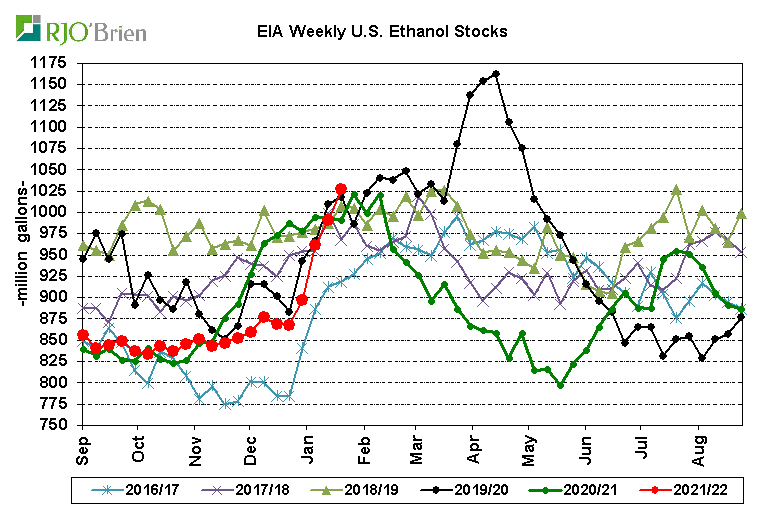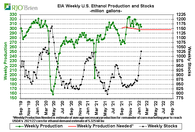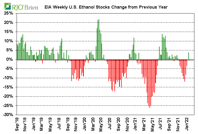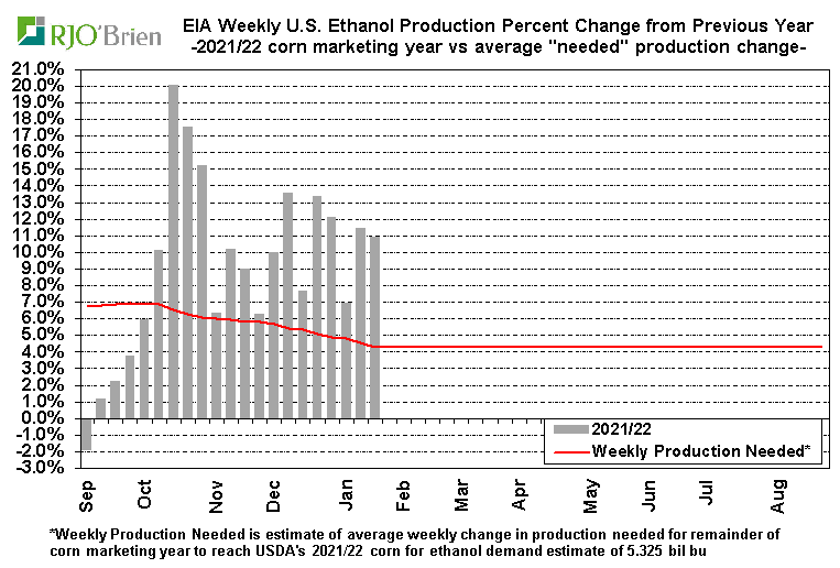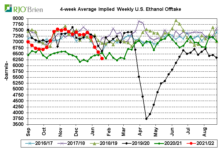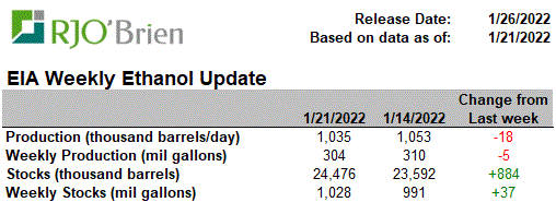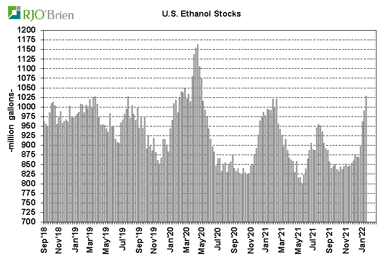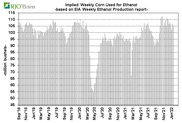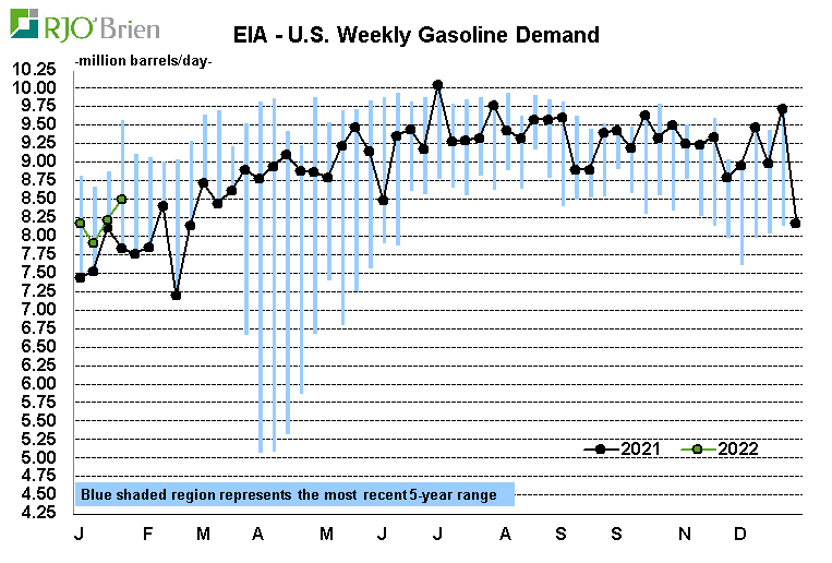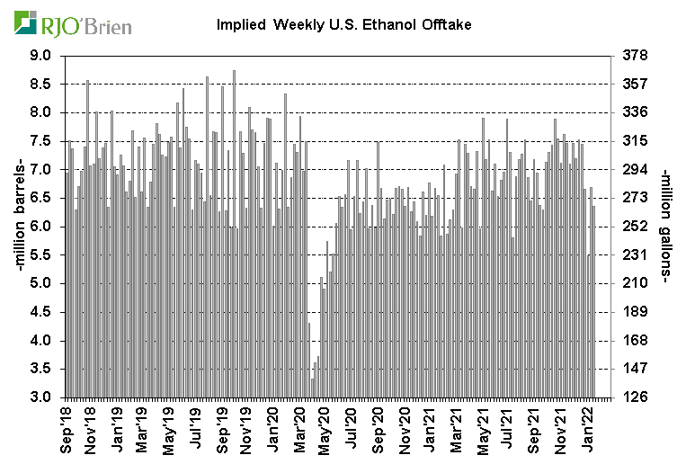 U.S. ethanol production, for the week ended 1/21/22, slipped to 1.035 million barrels/day (304 million gallons/week) from 1.053 mbpd (310 mil gallons/week) the week prior, reflecting a nearly 11% increase from year ago same-week production of 933k bpd (274 mil gal/week). While production has declined modestly in recent weeks, the overall pace continues to easily exceed the roughly 1.012 mbpd average we estimate is needed through the end of August to reach the USDA’s 5.325 billion bushel corn for ethanol usage estimate. Specifically, ethanol production over the most-recent 4-week period averaged 1.036 mbpd, 2.4% above the “needed” pace and 10.3% above year ago levels, but actually 2.2% below same-period production production two years ago. The production comparisons largely match the gasoline demand situation, as gas demand over the last four weeks averaged 6.2% above year ago levels, but 3.9% below 2020 levels. U.S. gasoline demand last week ticked up to 8.505 million barrels from 8.224 million the week prior, up 8.6% from last year but 3.3% below demand in 2020.
