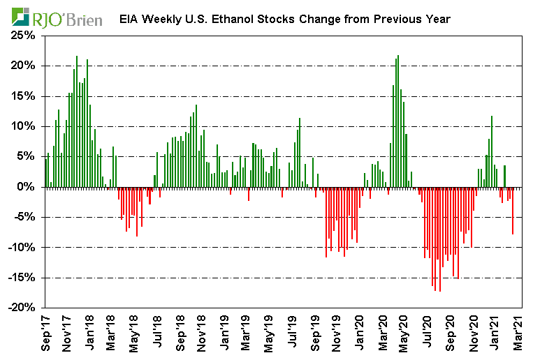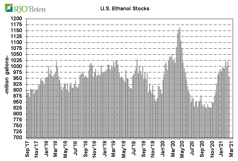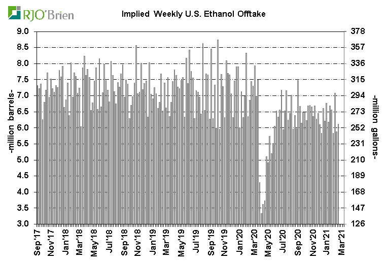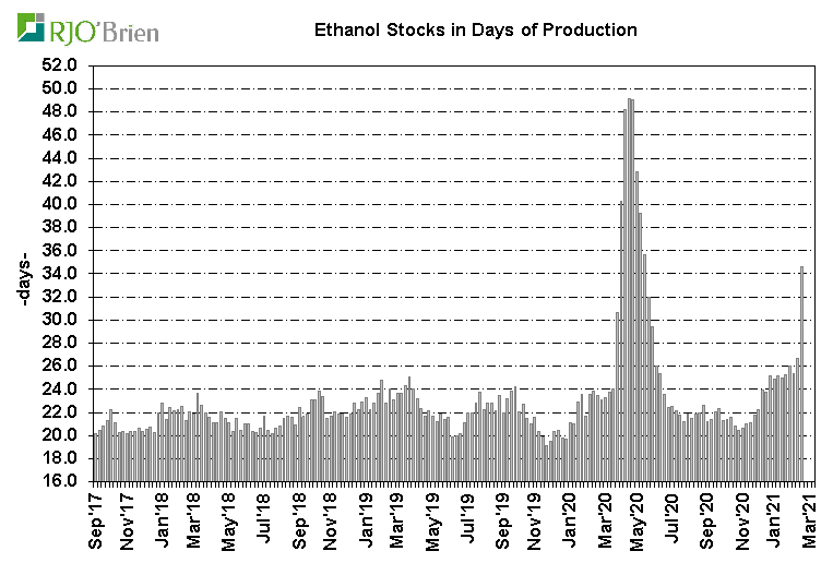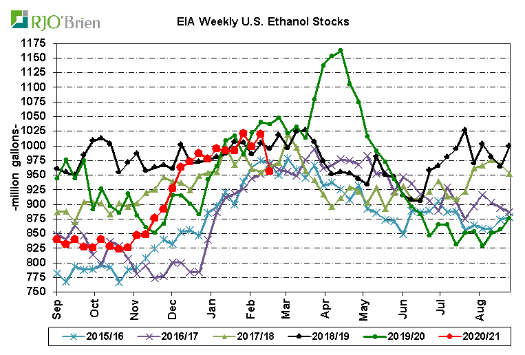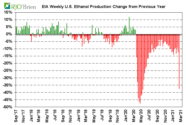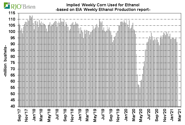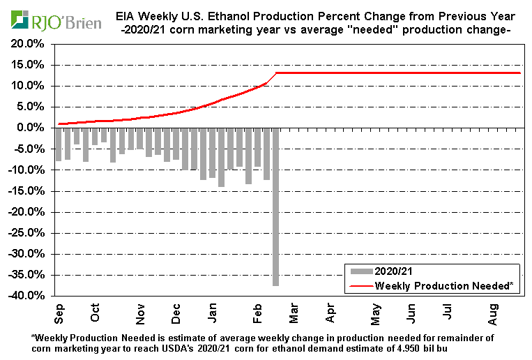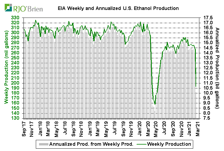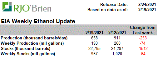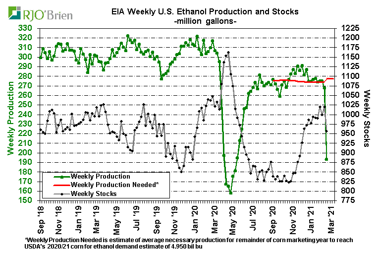 A significant decline in U.S. ethanol production last week was anticipated as a result of the long-lived arctic blast across the nation’s midsection, prompting historic spikes in natgas prices which, in turn, prompted forced and/or elected reduced ethanol production rates, but the actual production cuts were even larger than expected. EIA reported U.S. ethanol production, for the week ended 2/19/21, fell to 658k barrels/day (193 million gallons/week) from the previous week’s 911k bpd (268 million gallons/week), reflecting the largest single-week production decline on record since EIA began reporting weekly data in June 2010. For reference, last week’s 253k bpd production cut dwarfed the previous record weekly decline of 168k bpd during the first week of April 2020 as the COVID crisis quickly hit. For the week, an estimated 67 million bushels of corn was used for ethanol production, an impressive 1-week demand reduction/loss of 26 million bushels from the previous week. In all likelihood, that may prove to simply be lost demand as current margin structures/gasoline demand levels don’t really justify the need or potential to make up the production decline over the coming weeks/months. There are also questions about the potential of this week’s situation not only being a 1-week event so we would not be surprised by another week of very low, possibly even lower, production next week, as well. The lowest weekly ethanol production in the heart of the COVID crisis was 537k bpd, reflecting estimated weekly corn usage of 54 million bushels. Certainly ethanol production is expected to recover to recent-week levels in March, but again, this could very well play out to be a situation of simply wiping 50+ million bushels of corn demand off the balance sheet. In the current context of U.S. corn ending stocks expected to be below 1.5 billion bushels, the “finding” of 50+ million bushels is a material development.
