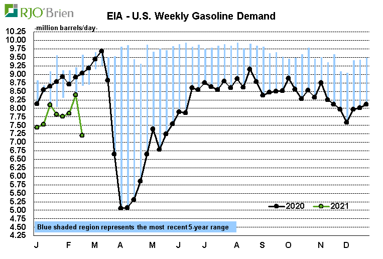 With the massive cut in production, U.S. ethanol stocks last week declined sharply, as well, to 957 million gallons (22.785 million barrels) from 1.020 billion gallons (24.297 mil barrels) the week prior, the lowest in 11 weeks and 81 million gallons below last year’s same-week stocks of 1.038 billion gallons. The 63 million gallon stocks decline was even larger than the largest single-week reduction during the COVID shock period last spring of 60 million gallons in the first week of May 2020. Over time, we would expect ethanol stocks to recover and begin working back towards recent levels as overall gasoline demand remains tepid, as well. On that note, the arctic blast prompted a notable decline in gasoline demand for the week to 7.207 mbpd from 8.407 mbpd the week prior, reflecting a 20% year-over-year decline vs the 10% average demand decline during the previous four weeks. Calendar year 2021 U.S. gasoline demand is averaging 10.8% below year ago levels based in the EIA’s weekly data.