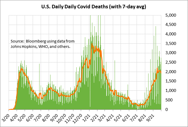 Weekly market focus — The markets this week will focus on (1) the prospects for the debt ceiling and the infrastructure and reconciliation bills, (2) continued concern about how the Evergrande debt crisis will unfold, (3) whether the U.S. Covid infection rate continues to fade, (4) the continued focus on Fed policy as the FOMC seems headed for a QE tapering announcement at its next meeting on Nov 1-2, (5) anticipation of Q3 earnings season, which begins next week with earnings reports from the big Wall Street banks, and (6) Friday’s payroll report (expected +488,000 after August’s disappointing report of +235,000).