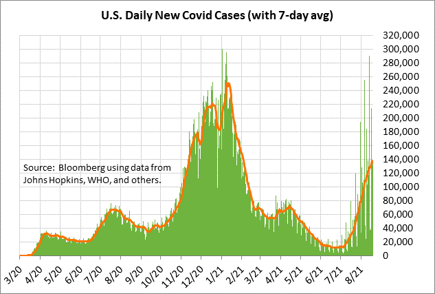 The 7-day average of new U.S. Covid infections on Tuesday rose to a new 6-1/2 month high of 138,082, then easing slightly to 137,957 on Wednesday. The slower rate of new infections can be seen by the fact that Wednesday’s average infection level was up by only 12.5% from the week earlier-level, which was a far slower week-on-week rise than the 30% rise seen last week and the peak of 66% seen in mid-July.