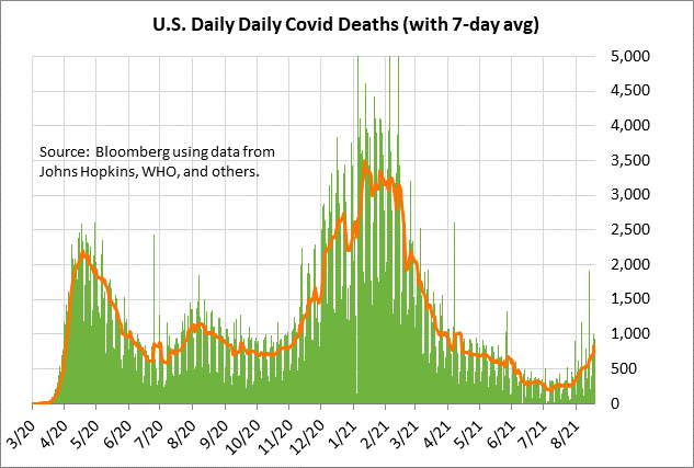 Vaccinations in the U.S. are at least being given at a higher rate due to (1) increased public fear about the delta variant, and (2) more locations requiring proof of vaccination. Bloomberg reports that a daily average of 823,355 doses have been administered over the past week, which is up from previous levels near 500,000.