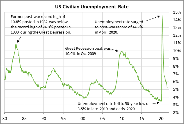 Job gains were curbed in August as the Covid infection figures continued to climb through the month. The 7-day average of daily U.S. Covid infections rose steadily during August, beginning the month at 69,942 and ending the month at 162,273. The 7-day average didn’t peak until mid-September at 171,850.