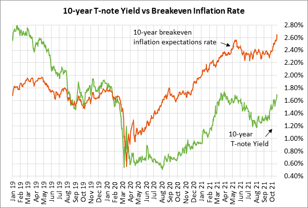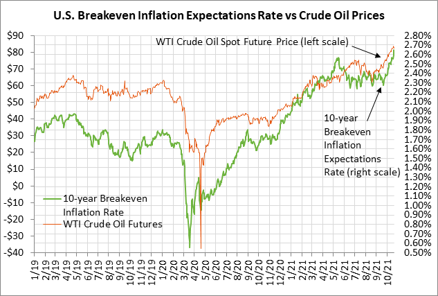 Inflation expectations have risen sharply in the past several weeks partly because of the rally in crude oil prices, which has raised fuel costs for businesses and consumers. The nearest-future WTI crude oil contract reached a 7-year high of $84.25 per barrel on Wednesday, before easing a bit to $82.50 on Thursday. WTI futures in the past 7 weeks have rallied sharply by a total of +23% from the $68.59 level seen on September 1.