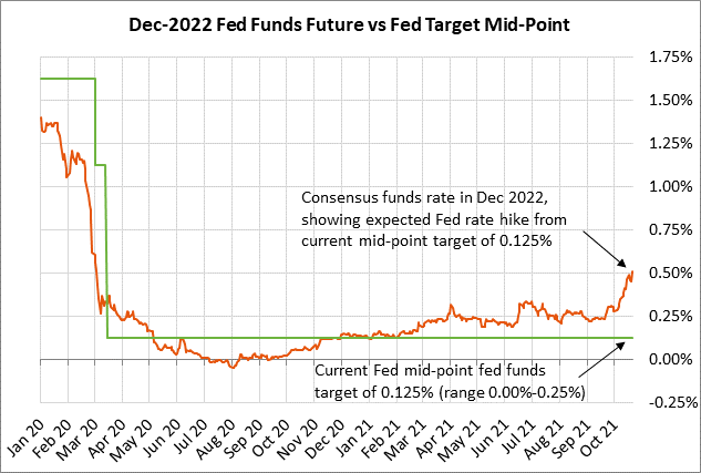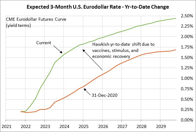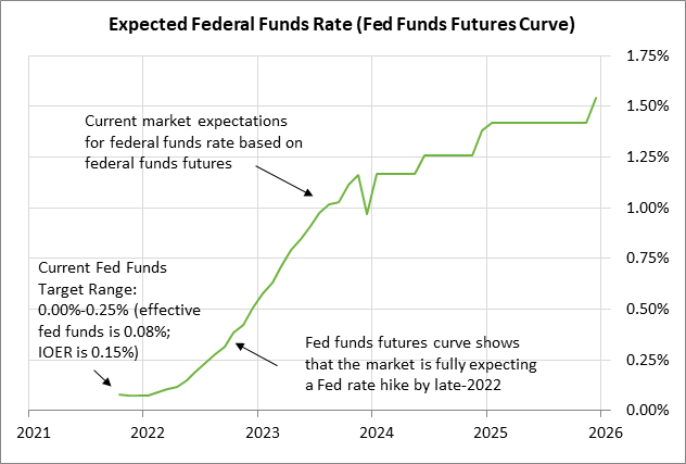 The sharp increase in inflation expectations is leading to expectations that the Fed will be forced to raise interest rates sooner than earlier thought. As recently as this past summer, the markets were not expecting the Fed’s first rate hike until early 2023. However, the market is now discounting the Fed’s first rate hike by Q3-2022 and a likely second rate hike in Q4-2022.