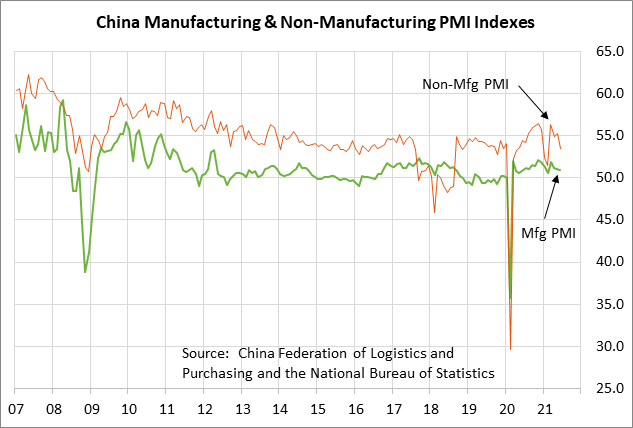 Chinese PMI reports expected to show small declines — The consensus is for tonight’s Chinese July PMI reports to show small declines as China’s post-pandemic economic surge fades. The consensus is for today’s Chinese July manufacturing PMI to show a small -0.1 point decline to 50.8, adding to June’s -0.1 point decline to 50.9. Today’s July non-manufacturing PMI is expected to show a decline of -0.2 points to 53.3, adding to June’s large -1.7 point decline to 53.5.
