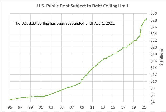 Meanwhile, the debt ceiling will be reinstated on Sunday at the current level of the U.S. debt, which means the U.S. government will no longer be able to borrow any net new amount of money that would push the U.S. national debt above the new limit. The Treasury will be able to conserve its cash with its usual emergency measures for some number of weeks. The CBO recently said that the Treasury may be able to last until October or November before hitting its X-date when it will run out of cash and will start defaulting on its financial obligations.