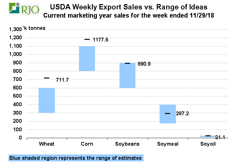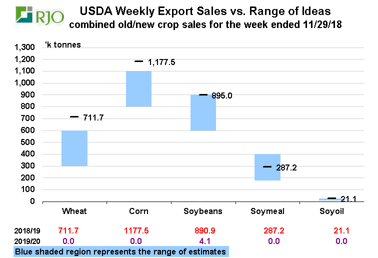 U.S. corn sales, for the week ended 11/29/18, were solid at 1.178 MMT (46.4 million bushels), coming in above market expectations of 800k-1.1 MMT, and followed last week’s rather solid sales, as well, of 49.9 million bushels. Additionally, sales were better than last year’s same-week sales of 34.5 million bushels, with the respectable sales in recent weeks allowing total commitments, now at 1.053 billion bushels, to tick back higher relative to year ago levels, as the current 16.8% year-over-year gain (902 million in sales last year) reflects an improvement from the 13.4% gain two weeks ago. However, the focus for the corn export program is not necessarily on the immediate timeframe as the January through mid-March period looms large with the 11-week period last year seeing corn sales average 69.2 million bushels (1.76 MMT)/week, as 762 million bushels (19.3 MMT) of sales were put on the books during the period. Without any indication at this time of weather complications for South America’s crop, we anticipate the 2018/19 U.S. corn export picture looking much less rosy compared to last year as we go through the first quarter of 2019. Our concern continues to lie with the fact that corn sales will need to average roughly 35.3 million bushels/week over the 9 months to reach the USDA’s export projection, not too far off of last year’s record pace of 38.0 million/week from this point forward. The largest sales this week went to Mexico with 310k tonnes, followed by Japan with 293k.