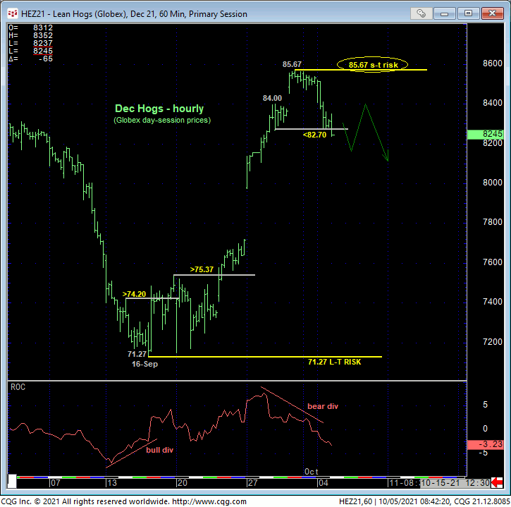 We discussed the developing potential for a bearish divergence in short-term momentum in yesterday’s Technical Blog. This morning failure below our tightened short-term risk parameter at 82.30 CONFIRMS this divergence and defines Thur’s 85.67 high as the end of the rally from 16-Sep’s 71.27 low and exposes a suspected correction of this rally of indeterminable scope. And given the extent and uninterrupted manner of mid-to-late-Sep’s recovery that left nothing in the way of battlegrounds on the way up that might be looked to for support, a more extensive, if intra-range relapse should hardly come as a surprise.