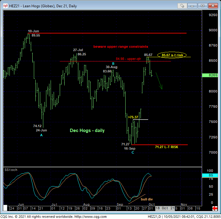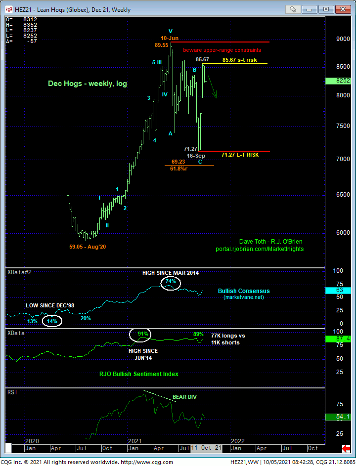 The fact that this admittedly smaller-degree momentum failure stems from the upper-quarter of the 4-month range contributes to a count calling for at least interim downside vulnerability. And with an 87% reading in our RJO Bullish Sentiment Index reflecting 77K Managed Money long positions to just 11K shorts, fuel for downside vulnerability is in ample supply.