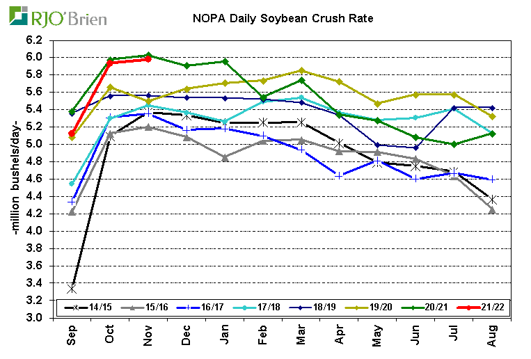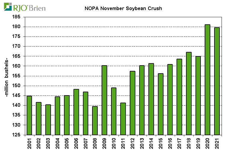 NOPA reported its members crushed 179.5 million bushels of soybeans in November, below average market expectations of 181.6 million, down from 184.0 million in October and below last year’s 181.0 million. The continued very strong crush margin structure was expected to result in another month of record crush, and while only slightly below year ago levels, November crush fell short of expectations. Based on the recent-month relationship between NOPA and nationwide crush, today’s data implies U.S. total crush in November was around 191.5 million bushels vs 196.9 million in October and 191.0 million bushels last year, potentially still a record for the month as the difference between nationwide crush and NOPA crush has increased a bit over the last year. Additionally, last month’s NOPA report (October data) reflected the withdrawal of one member from reporting, while nationwide crush was 7.0% larger than NOPA, larger than the average 6.3% difference over the previous six months and implying a roughly 7% difference between the two may need to be assumed moving forward. Accordingly, we currently see 1st quarter (Sept-Nov) U.S. soybean crush around 553 million bushels vs last year’s 559 million, leaving 2nd-4th quarter crush needing to total 1.637 billion bushels in order order to reach the USDA’s 2.190 billion bushel annual estimate, which would be up 3.5% (55 million bushels) from last year’s 1.582 billion.