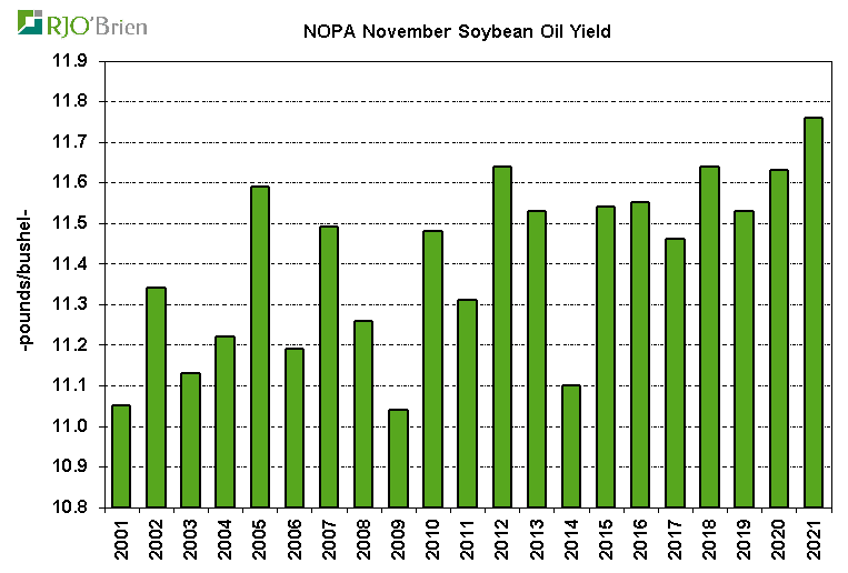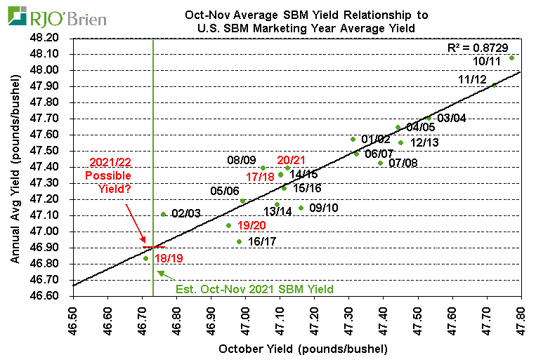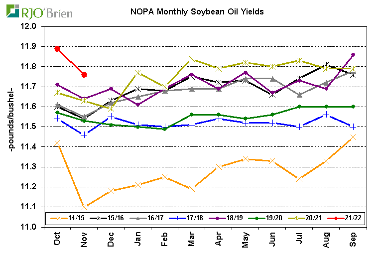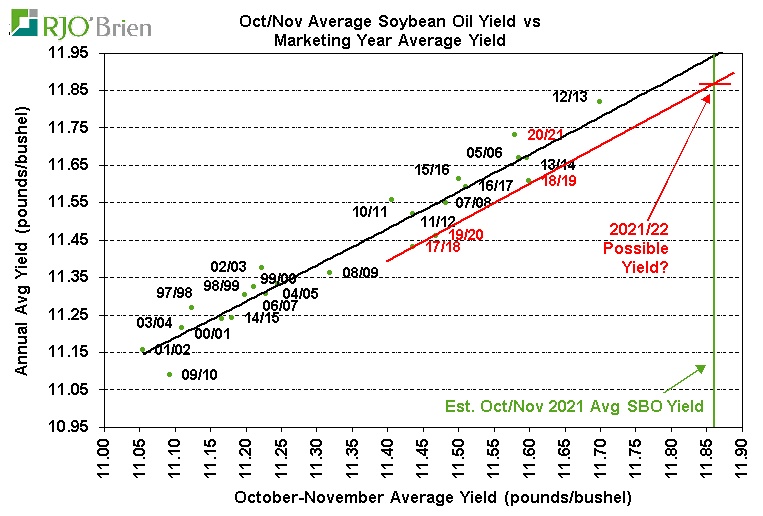 NOPA reported its members produced 2.110 billion pounds of soybean oil in November, down from 2.187 billion in October and nearly unchanged from last year’s November production 2.105 billion. Similar to the situation with crush, the withdrawal of one NOPA-reporting member last month resulted in nationwide soybean oil production being 7.3% larger than NOPA-reported production vs the 6.5% difference over the previous six months, prompting ideas of total U.S. soybean oil production in November around 2.264 billion pounds vs 2.348 billion in October and 2.282 billion pounds last year. The average soybean oil yield among NOPA members declined to 11.76 pounds/bushel from the very-high 11.89 in October, but was still a record for the month of November and significantly above last year’s 11.63 pounds/bushel. Additionally, soybean oil yields historically have regularly declined from October to November, having done so in each of the last 10 years, so we do not see the dip being a warning sign of a potential change in our view of 2021/22 average yields proving larger than the USDA’s current 11.75 pound/bushel assumption. On that front, we estimate the nationwide November soybean oil yield being around 11.79 pounds/bushel based on the recent-month relationship between NOPA and U.S. totals. Following the October average yield of 11.92 pounds/bushel reported by USDA in the latest Oilseeds Crushings report, the Oct-Nov average yield would be 11.86 pounds/bushel vs last year’s 11.58 and would easily be a record for the two-month period, exceeding 2012/13’s previous 11.70 record. The following chart shows the relationship between the Oct-Nov average soybean oil yield and the marketing year average yield, again highlighting the extremely strong relationship between the two factors. Based on this year’s situation, using the 2017/18-2019/20 period as a proxy, the 2021/22 average yield looks very likely to prove to be around 11.85-11.87 pounds/bushel vs last year’s 11.73 average and the USDA’s current 11.75 assumption. If this is the case, using the USDA’s current 2.190 billion bushel crush estimate, 2021/22 soybean oil production would be around 240 million pounds larger than USDA is projection. Using our 2.205 billion bushel crush estimate, production would be more than 400 million pounds larger than USDA. On a final comment on the topic, it is interesting to note the marketing year average soybean oil yield over the last three years has essentially been identical to the Oct-Nov average, but in the 10 years prior, the marketing year yield averaged .08 pounds/bushel above the Oct-Nov average – which would imply the potential for an 11.90+ pounds/bushel average yield this year if that proves to be the case again.