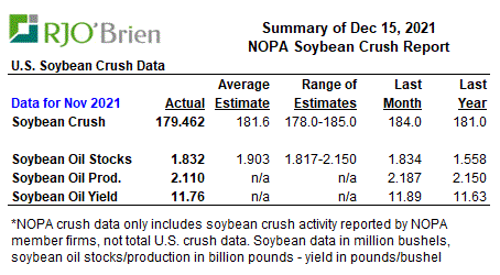 NOPA reported soybean oil stocks at the end of November held by its members were 1.832 billion pounds, essentially unchanged from 1.835 billion in October, but still significantly above last year’s 1.558 billion and easily the highest for the month in nine years. However, with crush being lower than expected, it’s not surprising soybean oil stocks were also below average market expectations of 1.903 billion pounds, as well. Based on the recent-month relationship between NOPA stocks and nationwide stocks, while also making a minor adjustment for the withdrawal of the NOPA-reporting member last month, we would estimate U.S. total soybean oil stocks at the end of November being around 2.390 billion pounds vs 2.386 billion in October and 2.111 billion pounds last year.
