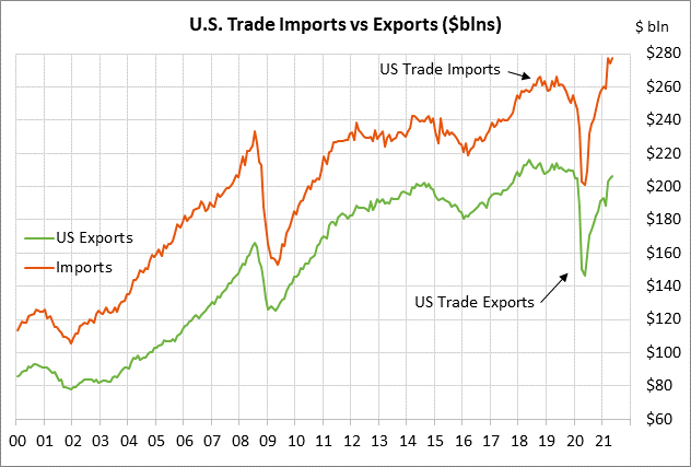 The U.S. trade deficit continues to be extremely wide as the strong U.S. economy pulls in a large amount of imports, while demand for U.S. exports lags due to weaker overseas economic growth. Imports have risen sharply over the past year and have easily posted a new record high, while exports have yet to exceed their pre-pandemic high.