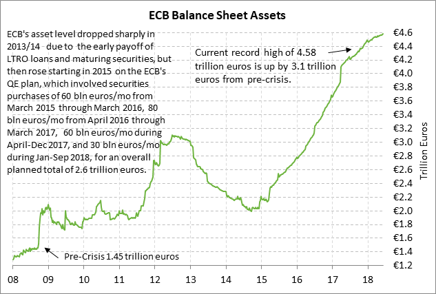 Whenever the ECB does make its QE announcement, the market consensus is for the ECB to taper its QE program from its current level of 30 billion euros per month to 10 or 15 billion euros per month in Q4-2018 and then allow the program to end altogether at the end of 2018. The markets would receive a hawkish shock in the unlikely event that the ECB instead decides to end its QE program at the end of September. The ECB has already said that after ending its QE program, it will reinvest the proceeds of maturing securities by buying new securities, thus ensuring that its balance sheet remains constant. Without that reinvestment, the ECB’s balance sheet would slowly decline and therefore would tighten monetary policy.