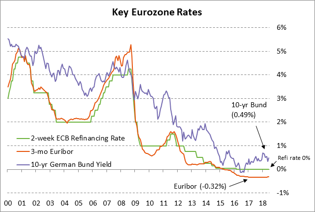 The markets will also carefully watch the ECB’s interest rate guidance to see if there is any chance in the current language that rates will remain unchanged “well past” the end of the QE program. The market consensus is that the ECB will raise its -0.40% deposit rate in Q2-2019 and its refinancing rate of zero in Q3-2019, according to a recent survey by Bloomberg.
