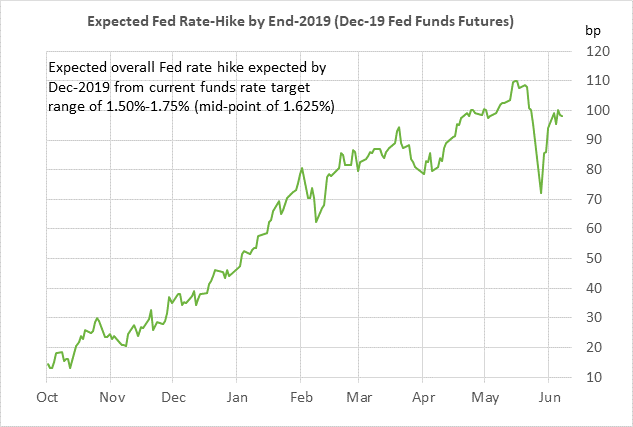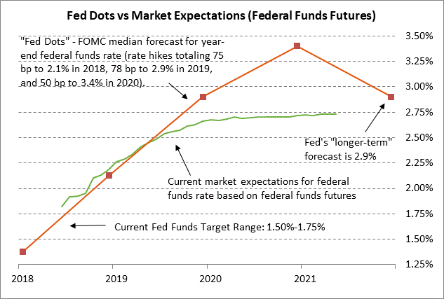FOMC members think they will have a clear shot for steady rate hikes through 2020, but the markets think the Fed is going to run into a brick wall in late 2019 and fail to be able to raise the funds rate any higher than 2.75%. That brick wall could involve any number of problems including (1) a recession, (2) a global trade war, (3) banking system problems from higher interest rates, (4) an overseas financial crisis such as a Eurozone or Chinese meltdown, or (5) geopolitics.